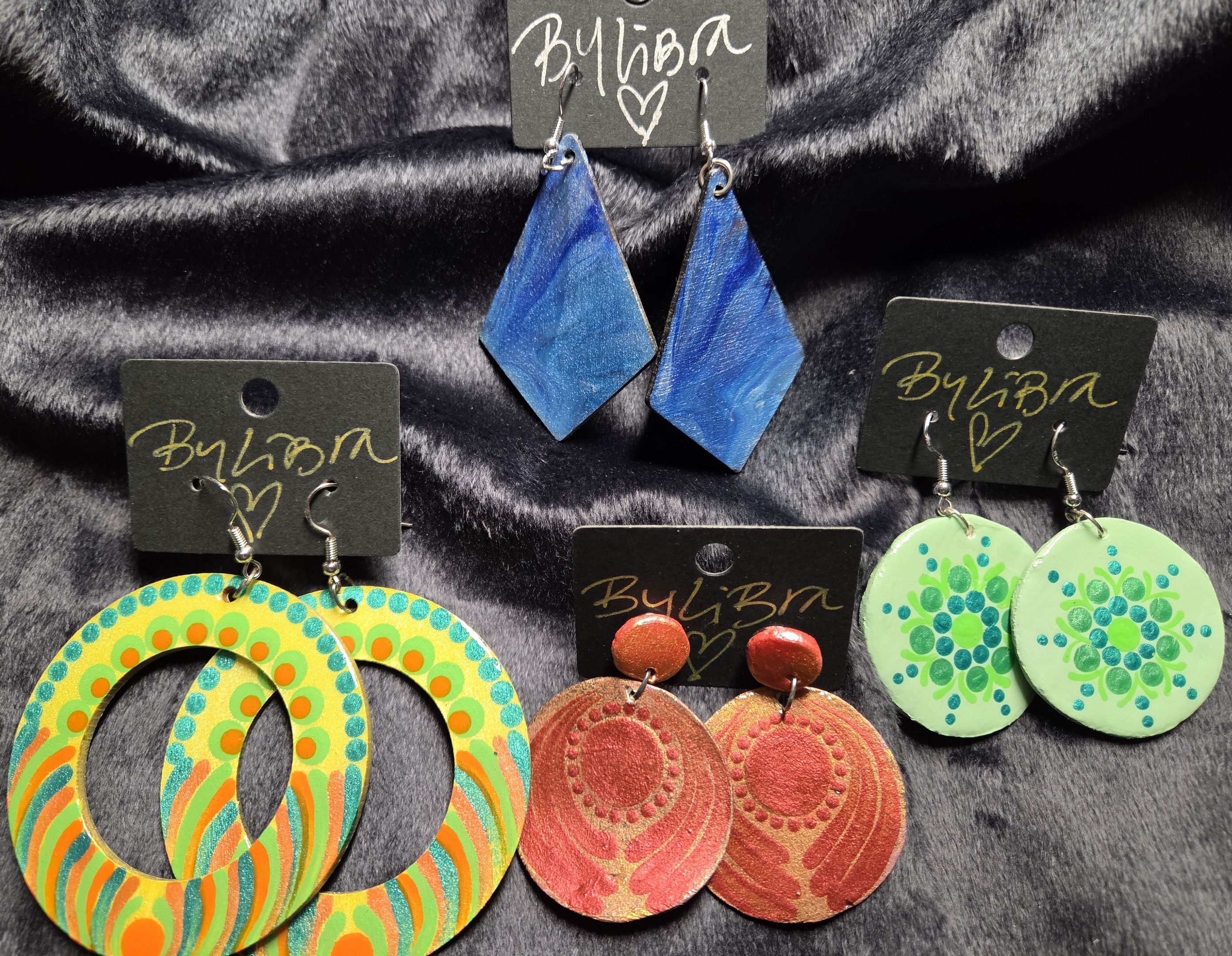 Örhängen är roligt att göra! Jag gör dem i olika material så som trä samt lera. Dessa målar jag sedan med Mandalmönster eller med fluid art.